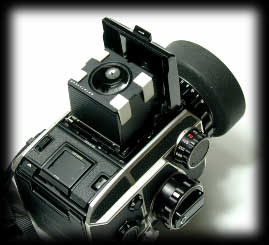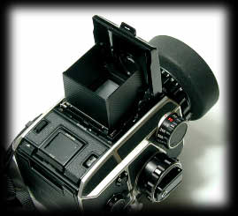 ハッセル用ルーペ・・・ヤフーのオークションで入手したときルーペはどうも視度補正付きで私の目には全く合っていない。 初老の父親には大変よく見えるらしく、取りあえず標準のルーペは気長に探すこととして、フードを起こした後に簡単に載せる方式とした。 ハッセルのルーペは写真のように受板ごと交換のため単純にプラスチックの足を付けただけでうまく固定されるようになった。 この足は建材用の見切材料で挟んであるだけで、無くしてもいくらでも代わりがあるのがいい。 ここでもECのフードの起き方は芸術的である。
